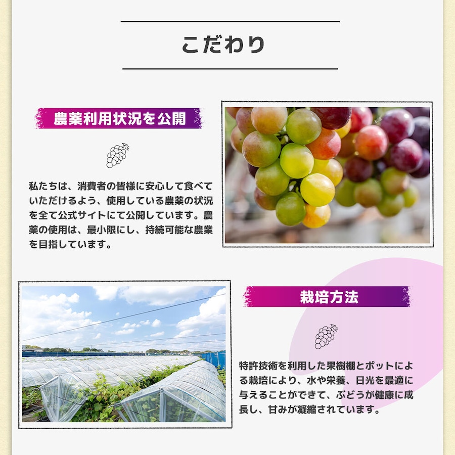 私たちは一房ごとに愛情を込めて育てています。この特別なぶどうで、皆さまの食卓に幸せをお届けできれば嬉しいです。」